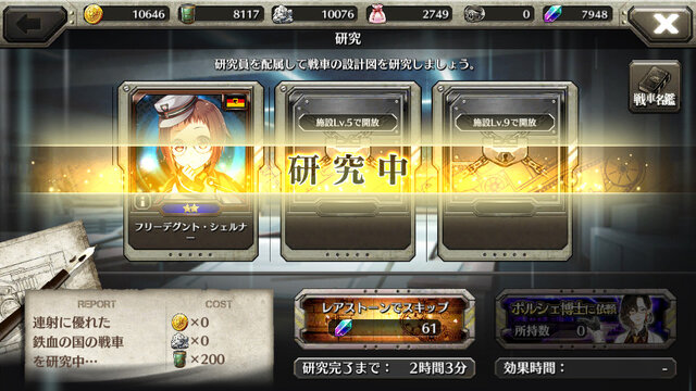 基地でできることでは「スカウト」と「研究」も大切な要素。「スカウト」は、特殊な能力を持った英雄たちを自軍に招聘する、いわゆるガチャのこと。「研究」は、英雄たちの中から研究員を指定し、資源を用いて戦車の開発をします。設計図を正しく理解できるか(狙い通りの車種を開発できるか)がカギになりそうです。