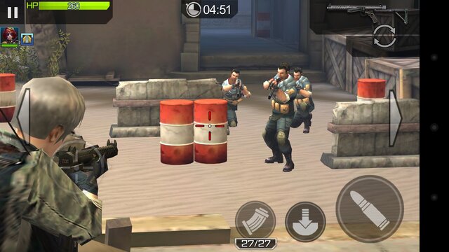 プレイヤーは特殊部隊の一員として敵と戦いを繰り広げていくのですが、本作も基本的なルールはとても簡単。相手を撃ち、危険な時は障害物に隠れればOKです。どちらもタップ操作で特に複雑な要素はありません。相手の頭を狙ったり、あるいは時にはドラム缶を撃ったりグレネードを投げて爆発を起こして、敵を倒していきましょう。