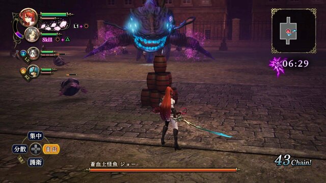 基本的な戦闘画面の右上にはダンジョンミニマップ、右下にはコンボ数。左上にアルーシェの体力、リリィバーストのゲージ、リリィの体力、ダブルチェイスのゲージ、左下には仲間への指示が表示されます。