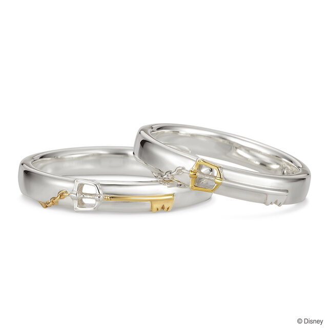 透かし加工や2色の金属を用いて「キーブレード」を表現した結婚指輪(ペアリング)。セット価格:210,000円(プラチナ950×K18イエローゴールド)、185,000円(K18ホワイト×イエローゴールド)、30,000円(シルバー)。