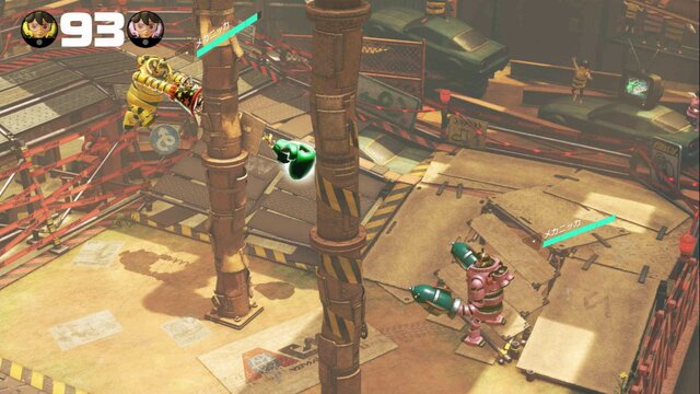 高台で戦うにしても平地で戦うにしても、まずは柱が邪魔です。最初はチャクラム系のアームが有効ではありますが、やはりこの柱が壊れてからが本番。アームやファイターにより得手不得手は異なりますが、やはり高台側に居座ったほうが強いでしょう。基本的には下からの攻撃が届きにくく、上からはラッシュが届きやすいです。