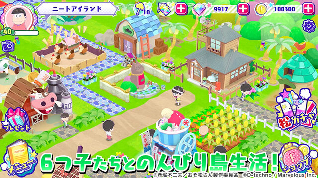 『おそ松さん よくばり!ニートアイランド』は、人気アニメ「おそ松さん」に登場するお馴染みの6つ子たちと、まったりとした島生活が楽しめる牧場ゲーム。2頭身にデフォルメされた6つ子たちの可愛らしいリアクションや、本作だけのオリジナルストーリーなど、「おそ松さん」好きには堪らないコンテンツが数多く用意されています。