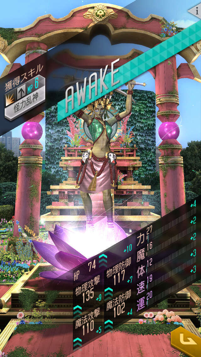 レベルアップ、レアリティアップによる強化とは別に、各悪魔は一度だけ「覚醒」が可能。覚醒すると各種パラメータが上昇し、更にスキルスロットが解放されます。より多くのスキルが使用できるようになるので、戦略の幅を更に広げる強化手段と言えます。