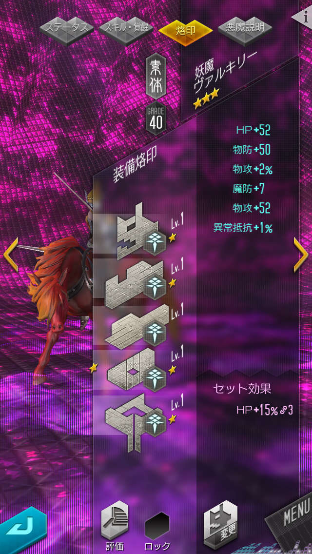 この烙印は、各部位ごと(頭、左腕、右腕、胴、足)に付けることができ、また悪魔ごとに付けられる烙印の形が異なります。セット装備をするとステータスアップにボーナスが入るので、運良く集った場合は揃えて身に付けるのもひとつの手。烙印自体をレベルアップさせることもでき、レベルアップした烙印はよりステータスを強化できます