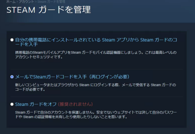Steamガードを管理をクリックすると認証方式を選ぶことができます。スマートフォンアプリを利用する形と、ログイン時にメールで認証する形のどちらかを選ぶことができますが本誌ではSteamアプリを利用するのを推奨いたします。