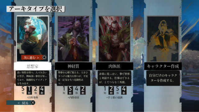 今回は知性派軟弱刑事ということで、「知性」にステータスを極振り。余った数値は「精神」に振って、「とてつもなく博識で感受性もそこそこに豊か、しかしフィジカルは最悪」「得意なのは“世界を推論する”ための力である『論理』スキル」という刑事を作り上げました。
