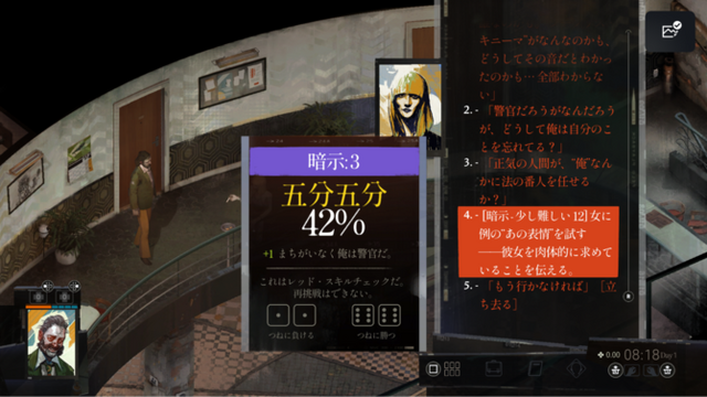 ちなみに、この主人公は強いストレスを受けるだけでも再起不能になったり、ゲームオーバーになってしまうことがあります。彼は記憶喪失のポンコツ野郎なので、警察手帳も銃もどこかに紛失してしまっているそう。そんなことを警察の仲間たちに素直に報告したら……自責の念でどうなるか分かりませんよね。なので、無線連絡中に話す必要が出来てしまっても「演劇」スキルに頼って嘘で切り抜けられます。