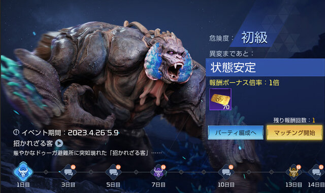 内容:「物資収集」「エリア掃討」「ダンジョン」「VR戦」「支援クエスト」等のクエストでもらえる報酬が、期間限定でアップいたします。各クエストの報酬アップ期間についてはゲーム内でご確認ください。