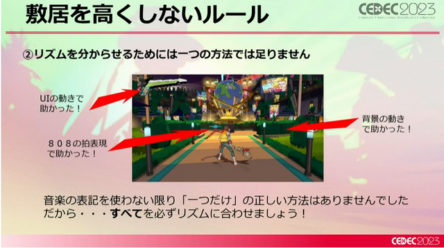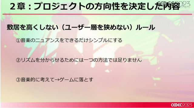 まずひとつめが「音楽のニュアンスをシンプルにすること」です。音楽の要素を複雑にすると分かってくれるユーザーが減るため、リズムは誰でもわかるリズム感に絞りました。