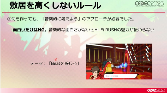 とはいえ、リズムとアクションのバランスをどのようにするかは不透明でした。先のジョハナス氏のスライドでは、『Hi-Fi RUSH』はアクション寄りでリズムの要素が入るバランスと説明されていましたが、山田氏によれば「実際に作ったとき、ケースバイケースでリズムゲーム寄りにもなってしまう」ところがあったといいます。