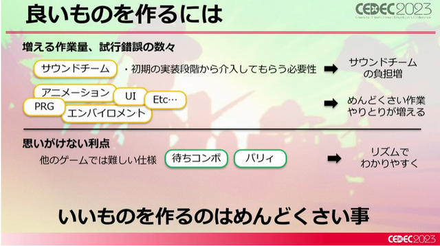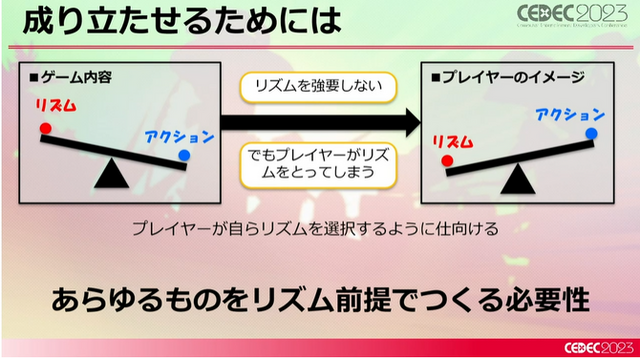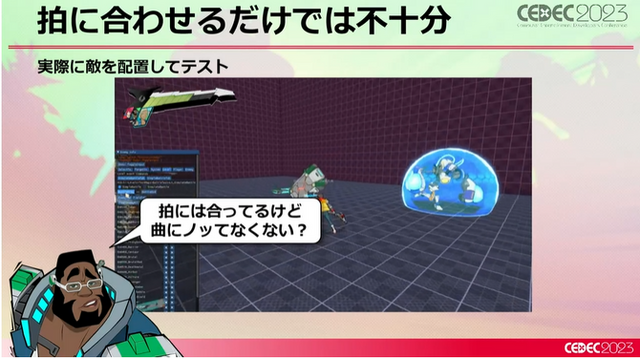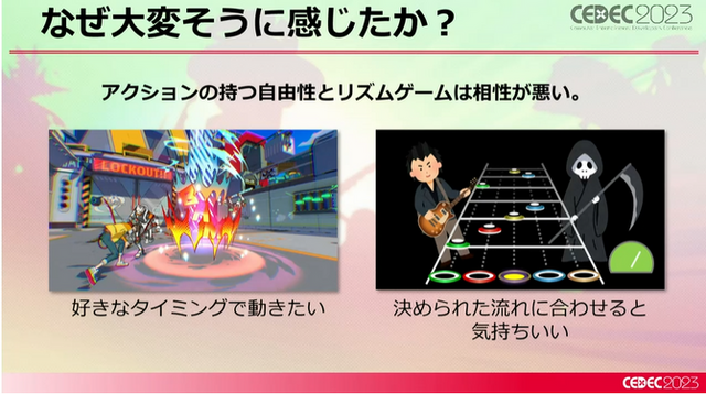 そもそも山田氏がなぜ大変そうと感じたかというと、やはり「アクションゲームは好きなタイミングで動きたい」もので、リズムゲームの音に決められた動きとは相性が悪いことを指摘。これは先述のジョハナス氏が語った問題そのままであり、山田氏はこの問題を具体的にクリアしていく必要がありました。