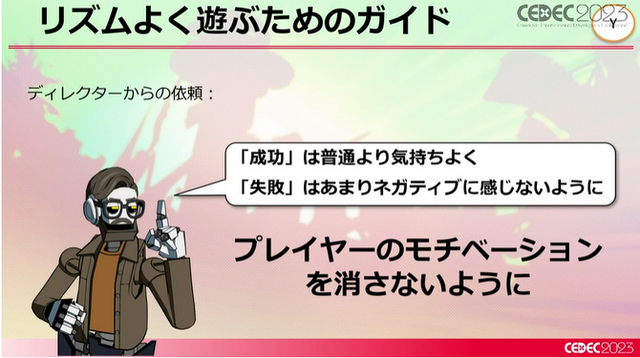 ジョハナス氏の山田氏への依頼として「リズムを取れた成功は普通よりも気持ちよく、取れなかった失敗はネガティブに感じないように」という指示がありました。要するに、プレイヤーのモチベーションを消さないようにすることが『Hi-Fi RUSH』には求められており、山田氏も「それを上手くやったことが本作の成功に繋がった」と振り返っています。