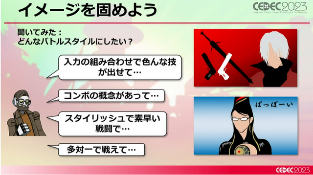 山田氏がジョハナス氏からバトルスタイルをどうするかを聞くと、やはり『デビルメイクライ』や『ベヨネッタ』系のアクションであると解答があったそうです。そもそも、山田氏はジョハナス氏に「山田さんも似たようなタイトルに関わってましたよね?」と言われ、基礎部分については結局“スタイリッシュアクション”だと確信したとのことです。