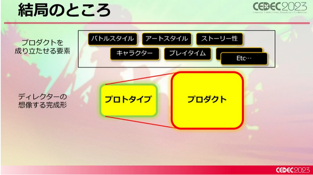 プロダクトは主にバトルシステムやアートスタイル、ストーリーなど数多くの要素で構成されており、山田氏はそれらをジョハナス氏から聞き取っていくわけですが、最終的には「プロトタイプ版をよりスケールアップしたものがプロダクト版である」と完成形を見定めました。