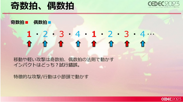 この問題は、リズムを奇数拍と偶数拍に分けることで解決しました。移動や軽い攻撃は奇数拍や偶数拍の法則で動かし、特徴ある攻撃やアクションは小節の頭である、強拍で動かす方法を取りました。ここで「リズムだけではなく、楽曲も意識する必要があった」ことも、開発の難易度を上げていました。