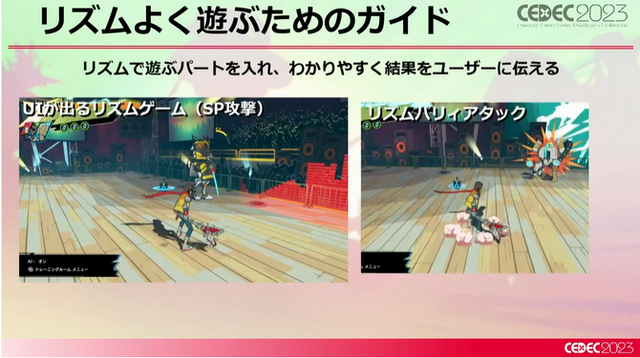 その他にもスペシャルアタックでは、よりリズムゲーム的なアクション演出を入れたほか、リズムパリィアタックのように拍に合わせたパリィなど、リズムで遊ぶパートを様々なことに仕込むことで、プレイヤーに能動的にリズムゲームにチャレンジしている感覚を作っています。