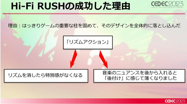 いよいよ本格的にアクションを作っていくわけですが、ここまでの講演のように『Hi-Fi RUSH』は普通のアクションゲームとコアのコンセプトが違っています。山田氏はそれを平たく「このゲーム作るの面倒くさっ!」と言い切ってしまいました。一方で、「逆に言えば、やり切ればいいものになる」とも考えており、さまざまな努力が伺えました。