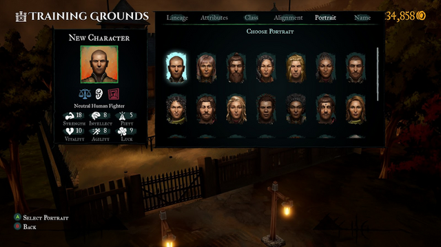 ボーナスポイントを割り振り、職業と善・悪・中立のいずれかの属性を決定したら、ポートレートの選択になります。画風の好みは置いておいて、現状はポートレートの選択が必須で、数が限られていて外部の画像を使うこともできません。ただし、単純に画像の数が増えるだけなのかはわかりませんが、将来的にこの機能は拡張される予定があるとのことです。