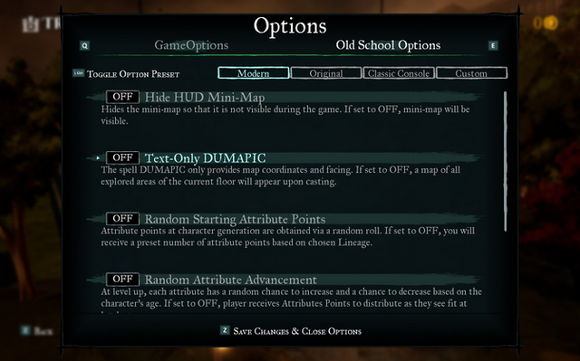本作では前述した能力周りを含め、多くの仕様が原作から大きく変わっていますが、本作のオプション画面には「Old School Options」という項目があり、ここでゲームの仕様を大幅に原作寄りへと戻すことができます。現バージョンで設定可能なオプション項目を簡潔に説明してみます。