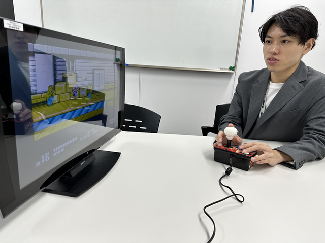 まずは、メディア対抗戦に出場した編集部員・Jがプレイ。右がスティック、左がボタンという普通のコントローラーと真逆のレイアウトに戸惑いつつも、すんなりと基本をマスターしていきます。