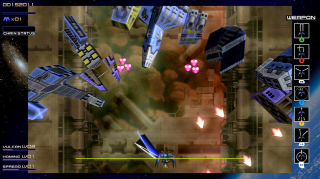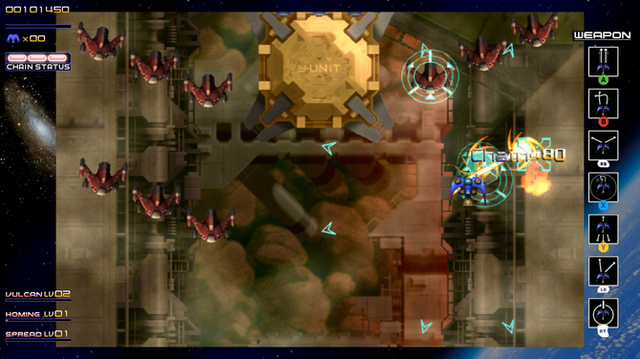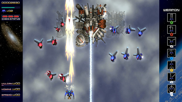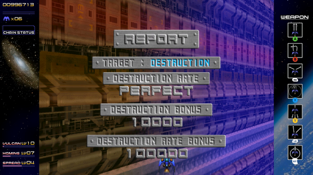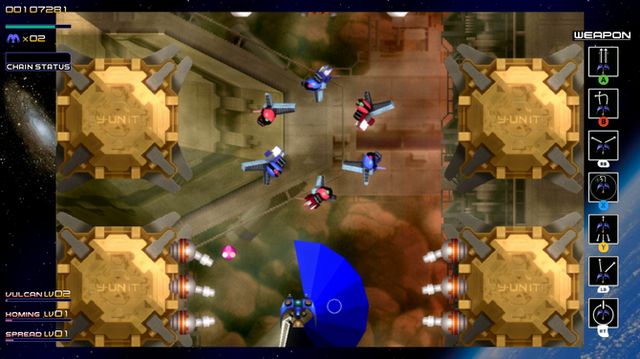 登場する敵にはそれぞれ赤・青・黄の三色が割り振られ、同色の敵を連続して倒し続けることでスコアが加算されるチェーンボーナスを得られます。このシステムは上述のレベルアップに関連するとともに、スコアアタックを極めうえでも重要な、本作の根幹をなす要素となっています。なお、HD移植版では同社開発の続編的作品『斑鳩』のスコアシステムに変更することも可能です。
