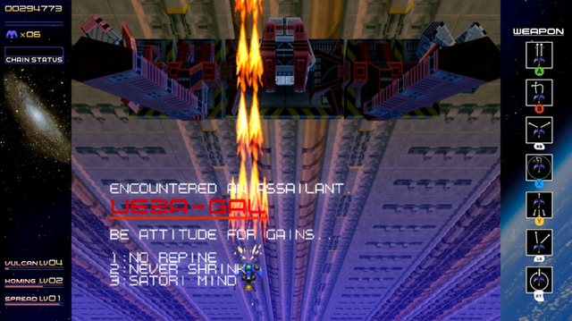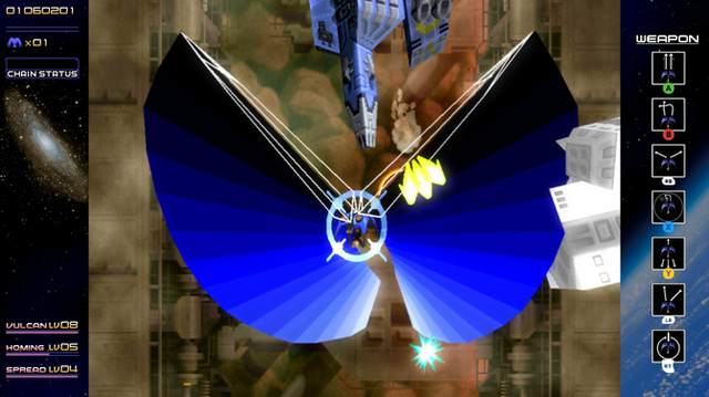 自機「シルバーガン」には6種類のショットが装備されており、前述のレイディアントソードを含め最初からいつでも制限なく使用可能です。それぞれのショットは稼いだスコアに応じて経験値が入りレベルアップし、性能が強化されていきます。