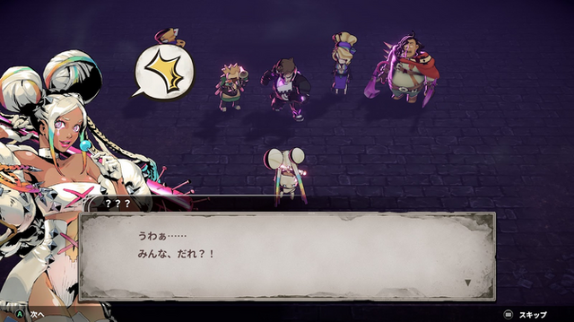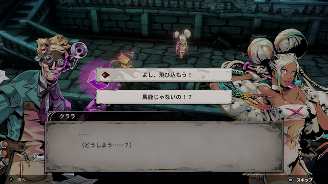 さあ始まりました『PENNY BLOOD: HELLBOUND』。タイトル画面からゲーム開始、4つのセーブスロットからひとつを選んで先へ進みます。冒頭ムービーと演出が始まりますが、2分ちょっとですぐにキャラクター操作パートに切り替わるため、「早くプレイさせてくれ!」と焦れることもなくスムーズな進行。簡単なチュートリアルを経て、これから戦いを共にする仲間との顔合わせイベントに繋がります。