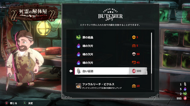 序盤ではまだまだ制限も多く寂しい風景かもしれませんが、出撃を重ねる毎に徐々に施設がアンロックされていき、仲間も少しずつ増えていくので賑やかになっていきます。施設やショップの利用に際しては、戦闘から持ち帰ったマリスタルや素材を通貨として使用します。