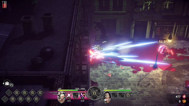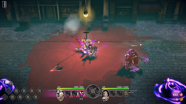 戦闘は通常攻撃を連打してコンボを繋ぎつつ、間にスキルを挟みつつブラッドサーフィン、ゲージ蓄積&解放によるエクスタシースキル(必殺技)を絡めては、群がる敵を蹂躙していきます。敵に攻撃を当てると血しぶきがあがり、敵が死亡すると死体周囲に血溜まりが広がります。
