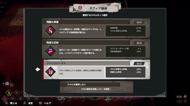 ところで戦闘終了毎にランダムでスキル(パッシブ系や攻撃系など)を入手できるのですが、例えば近接特化型の主人公クララに手裏剣めいた遠距離攻撃手段を与えてくれたりと、戦闘スタイルの凹凸を埋めてフォローするような使い方もできるので、戦略の幅が広がります。