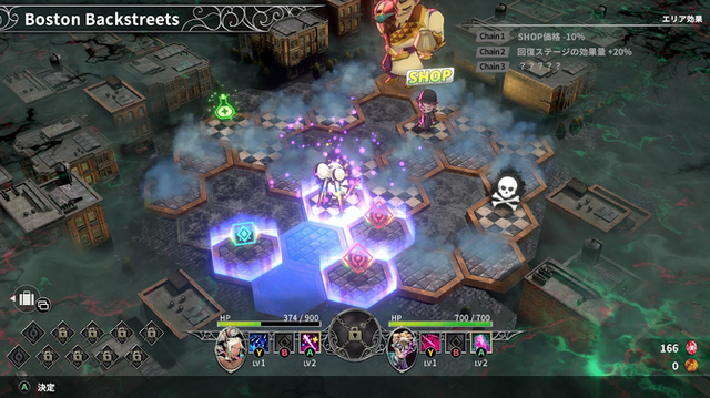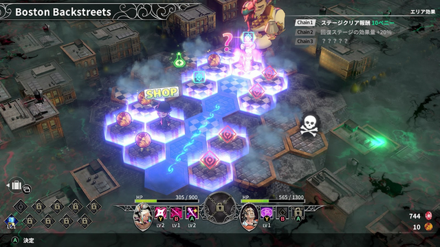 さてこちらは全体のステージマップ。六角形のマスが敷き詰められた盤面で構成されており、戦闘やショップ、救助をはじめとする各イベントのマスが散りばめられており、その最奥にはデカデカとステージボスが鎮座ましましています。