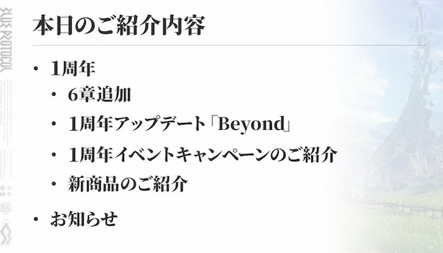 本作は6月14日で1周年。最初に「長い」と予告されたとおり3時間にわたり、シナリオ6章「閉ざされた森」、1周年アップデートについての説明が行われました。