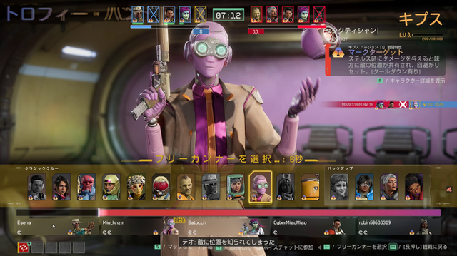 能力の通り前線よりは裏取り向きのキャラで、かなり身軽に動くことができます。トラップは味方にも位置を知らせるので、敵が歩きそうな場所にを設置しておけばチームに貢献ができます。