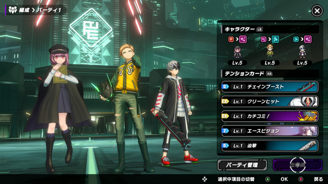 バトルはプレイアブルキャラとNPC2人をくわえた3人編成で行われます。バトルでは必殺技や連携技といった定番要素を備えていますが、特筆すべきは「テンションゲージ」という要素です。3つのフェーズに分けられたテンションを上げていくと、事前に編成していたカードによるスキルが発動し、非常に有利な状態で戦えることになります。