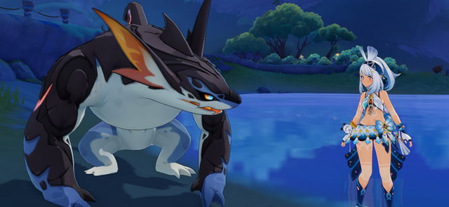 ムアラニは法器を使うキャラクターですが、通常攻撃のモーションはだいぶ控え目な性能です。代わりにざぶざぶサメくんの移動中、接触した敵にマーカーを付けて、その敵に対し誘導する水元素の突進攻撃を放つことができます。