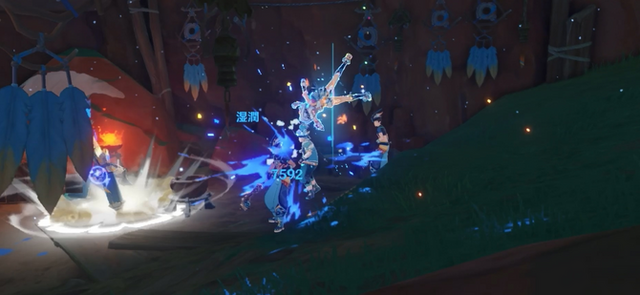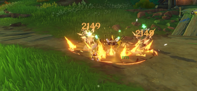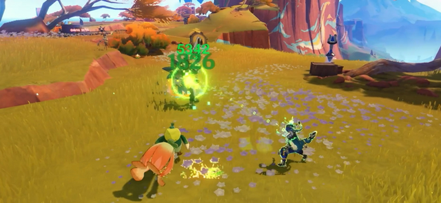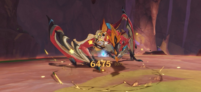 戦闘面ではカチーナもパーティの防御力を伸ばすのに便利です。彼女の乗り物「ぐるぐるコマちゃん」を使えば、ジャンプの落下で発生した衝撃波を岩元素ダメージとして与えます。結晶反応も起こしやすく、元素シールドでキャラクターの被ダメージを大きく抑えてくれるのです。