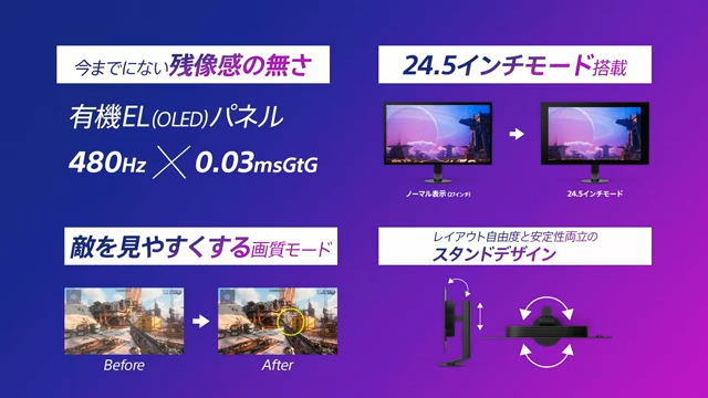 また、27インチのモニターを「24.5インチ」に切り替えるモードや、FPSに特化した画質モード「FPS Pro+ モード」と画質調整のための機能として用意された「FPS Proモード」の切り替え機能が備えられています。スタンドは、レイアウトの自由度と安定性を兼ね備えたデザインで、高性能かつ、プレイヤーにとって操作性の高いモニターとなっています。