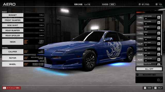 ここでは車の外観パーツやペイント、マーカーを設定できます。外観パーツからホイール、そしてライトなどもカスタマイズが可能。中にはとても派手なものもあったり、ホイールは現実の世界のメーカー公認のものがあったりと、かなり拘ることができます。
