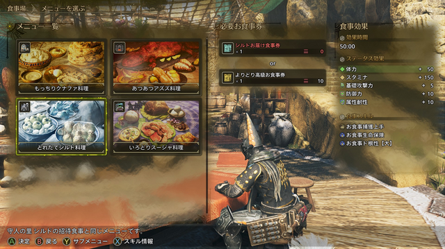 「料理(食事)」とは、『モンスターハンター』シリーズ早期から登場しているシステムです。様々なステータスバフを得られるため、“狩猟の前はとりあえず食べておこう”となる本要素ですが、『モンハンワイルズ』ではプレイヤー自身による「焚き火料理」のほか、各拠点の現地民から料理を振舞って貰うことも可能となっています。