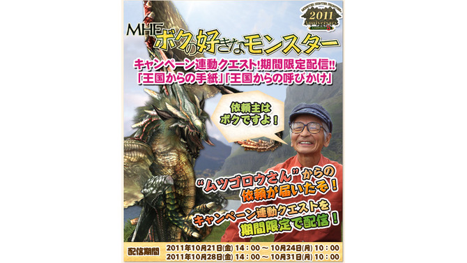 カプコンは、Xbox360/パソコン向けタイトル『モンスターハンター フロンティア オンライン』において、「MHF Anniversary 2011フェスティバル」にて実施のキャンペーン「MHFボクの好きなモンスター」連動イベントとして、「王国からの手紙」「王国からの呼びかけ」の2つのクエストの配信を10月21日より開始しました。これらのクエストは、「MHF Anniversary 2011フェスティバル」にて実施の「MHFボクの好きなモンスター」でおこなわれた投票で1番人気に輝いたベルキュロスが登場するもの。クエストの依頼主は、あのムツゴロウこと畑 正憲さん。しかも、クエストをクリアすることで、どちらも豪華な報酬を得ることが可能です。第1回配信は10月21日(金)14:00~10月24日(月)10:00、第2回配信は10月28日(金曜日)14:00~10月31日(月曜日)10:00となっており、2週にわたり週末限定配信されます。「王国からの手紙」の受注・参加条件はHRまたはSRが1以上(トライアルコースでもプレイ可能)。目的地は新大闘技場(温暖期/昼)で、ベルキュロスの1頭の捕獲、主目標への一定ダメージがマストオーダーです。またビギナーでも本クエストを充分楽しめる武具が貸与されるとのこと。クエストをクリアすれば、金銀たまご盛りだくさんがゲットできます。「王国からの呼びかけ」の受注・参加条件はHRまたはSRが81以上。目的地は峡谷(温暖期/昼)で、ベルキュロスの1頭の捕獲、主目標の頭部破壊、主目標への一定ダメージがマストオーダーです。クリアすれば、ベルキュロスのレア素材が複数ゲットできます。クエストに参加するには、ハンターライフコースが有効であること、または、公認ネットカフェを利用されていること(PC版のみ)、または「Nコース」が有効であること(Xbox360版のみ)が条件となっています。『モンスターハンター フロンティア オンライン フォワード.2“跳影、熱帯の猛き眷属”』は好評発売中。価格は通常版が6,090円(税込)、「MHFフォワード.2プレミアムパッケージ」が8,190円(税込)となっています。(C)CAPCOM CO., LTD. 2007, 2011 ALL RIGHTS RESERVED.
