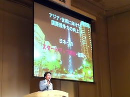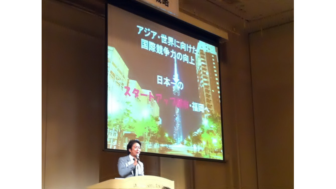 1974年生まれの「ファミコン世代」で、2010年11月に史上最年少の36歳で市長に当選した高島市長。冒頭の主催者挨拶では、福岡市を「人と環境と都市が調和のとれた、アジアのリーダー都市」にするというミッションを提示し、短期的には観光やコンベンション、中期的にはデジタルコンテンツによる都市戦略を推進すると紹介しました。その上でアジア・世界に向けた国際競争力の向上を図るために、「日本一のスタートアップ都市」にしたいと抱負を掲げ、企業誘致を呼びかけました。またゲーム産業についても、あらためて「福岡ゲーム産業振興機構」の取り組みを紹介し、行政の支援ぶりを示しました。