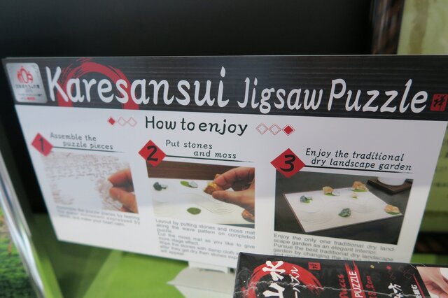 「枯山水」とは水のない庭のことで、実際の水を用いず、砂や石などを使って川や山を表現するという日本独自の手法。この「枯山水 ジグゾーパズル」ではピースを埋めることで砂紋(川の流れを表現する)が作られ、そこにグリーンの苔マットと本物の石を配置して完成させるというもの。ユーザーの感性で日本庭園の美しさを表現することができます。