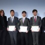 「ガンダム GLOBAL CHALLENGE」第一次選考に選ばれたのは、奈良先端科学技術大学院大学 情報科学研究科博士後期課程に在籍する金子裕哉さん、Chiang国立台湾大学 准教授のMing-Hsunさん、ロボフューチャー代表取締役の木原由光さん、東京大学情報システム工学研究室 在籍の岡田慧さん、以上の4名。岡田さんはあいにくの欠席となってしまったが、他3名は宮河氏とゲスト・プレゼンターのSUGIZO氏(LUNA SEA/X JAPAN)から記念の楯と賞金が贈られた。