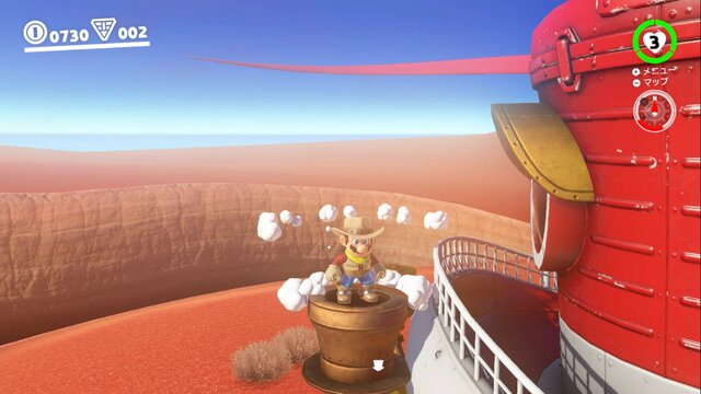 また、オデッセイ号には3つの入口が用意されています。正面のドアはもちろん、煙を吐いている煙突にしゃがんで入ることもでき、さらに屋上からヒップドロップして入ることも可能です。マリオ、入室するのにアグレッシブすぎ?