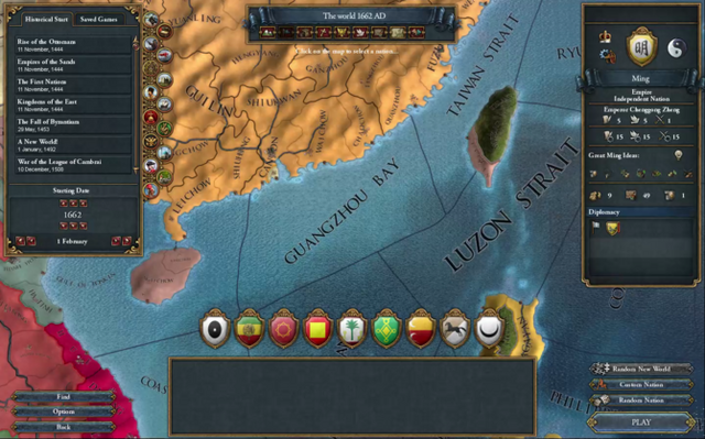 本作の優れた点は、いくつかの大きなシナリオ(ヒストリカルスタート)以外に、日単位でスタートシナリオを選べることです。鄭成功政権は大きなシナリオでは選択できず、1662年2月1日から6月22日までの約5か月間から選ばなければなりません。日単位で刻々と変化する世界マップを眺めるのが結構楽しく、この時点ですでに15分が経過してしまいました。こういう歴史ゲームは、ゲームを遊ぶことだけが楽しみではありませんしね。