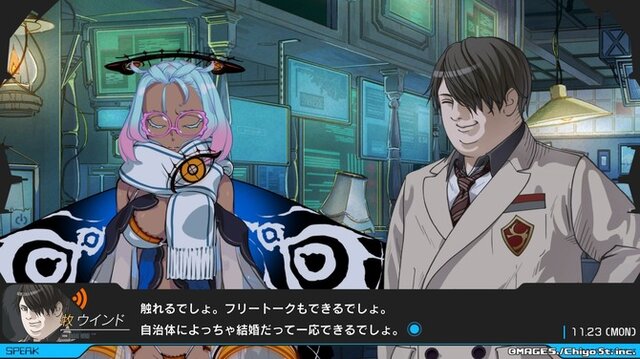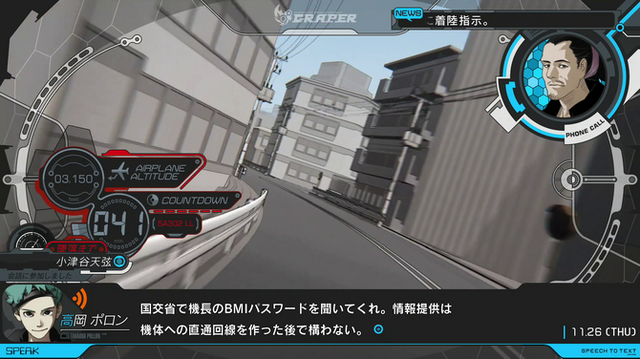 本作のUIは、基本的に主人公「高岡 歩論(ポロン)」のBMIを通しています。つまり、ポロンの視界に映るものをプレイヤー自身が見るということ(もちろんポロンの立ち絵はちゃんとありますよ)。ニュース速報や掲示板の書き込みなど、デスクトップに複数のウィンドウを並べるように、視界に投影されているのです。