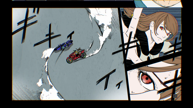 例えば画像上のこのシーン。これはバイクに乗ったまま、重要なアイテムの受け渡しをするシーンですが、バンドデシネ風に描かれています。コマ割りが変化していき、漫画に音楽とボイスが乗ったような表現を、重要なシーンでは採用しているのです。デジタルコミックソフト『メタルギアソリッド バンドデシネ』を想像するとわかりやすいでしょう。