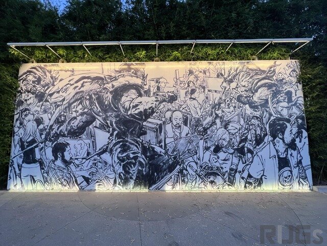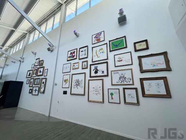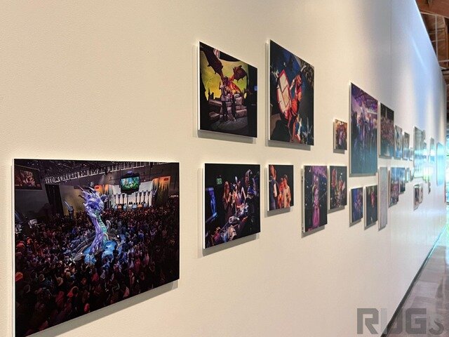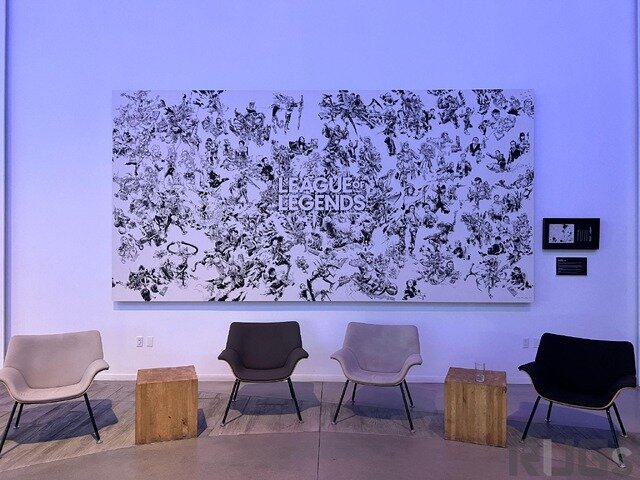 エントランスをくぐると、そこにはライアットゲームズが手掛けてきた作品や、eスポーツ関連のアートワークが展示されています。一部はディスプレイになっていて、代わる代わるさまざまなものが映し出されているため、いつまでも飽きずに過ごしていられます。