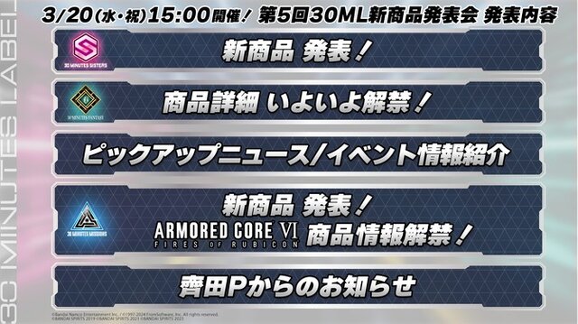 バンダイスピリッツは、同社のプラモシリーズ「30 MINUTES」レーベルの新商品発表会を3月20日15時から放送すると発表しました。
