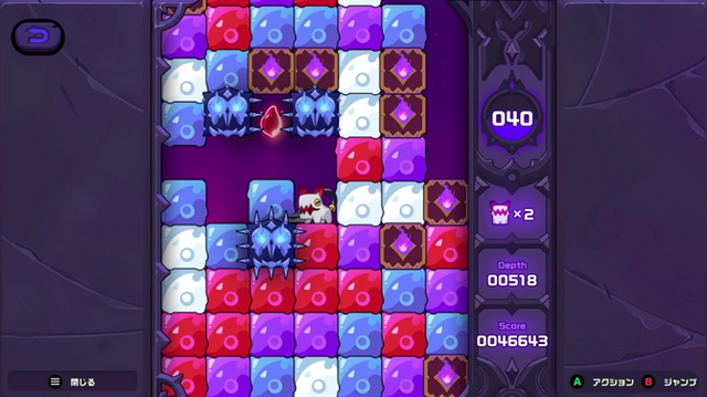「ソウルハウンド」は掃除機のような尻尾を使ってブロックを吸って削っていきます。そのため、道中に落ちているアイテムを直接拾わずとも、隣マスから吸って回収可能。“落ちそうなブロック”は『ミスタードリラー』でも壊せますが、「ソウルハウンドIII」では“上から落ちてくるノーマルブロック(または4回攻撃加えた「×印ブロック」)”も破壊できます。